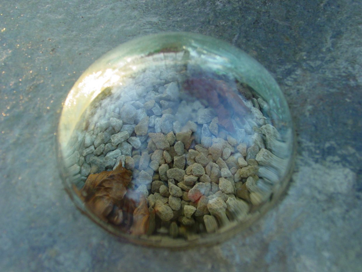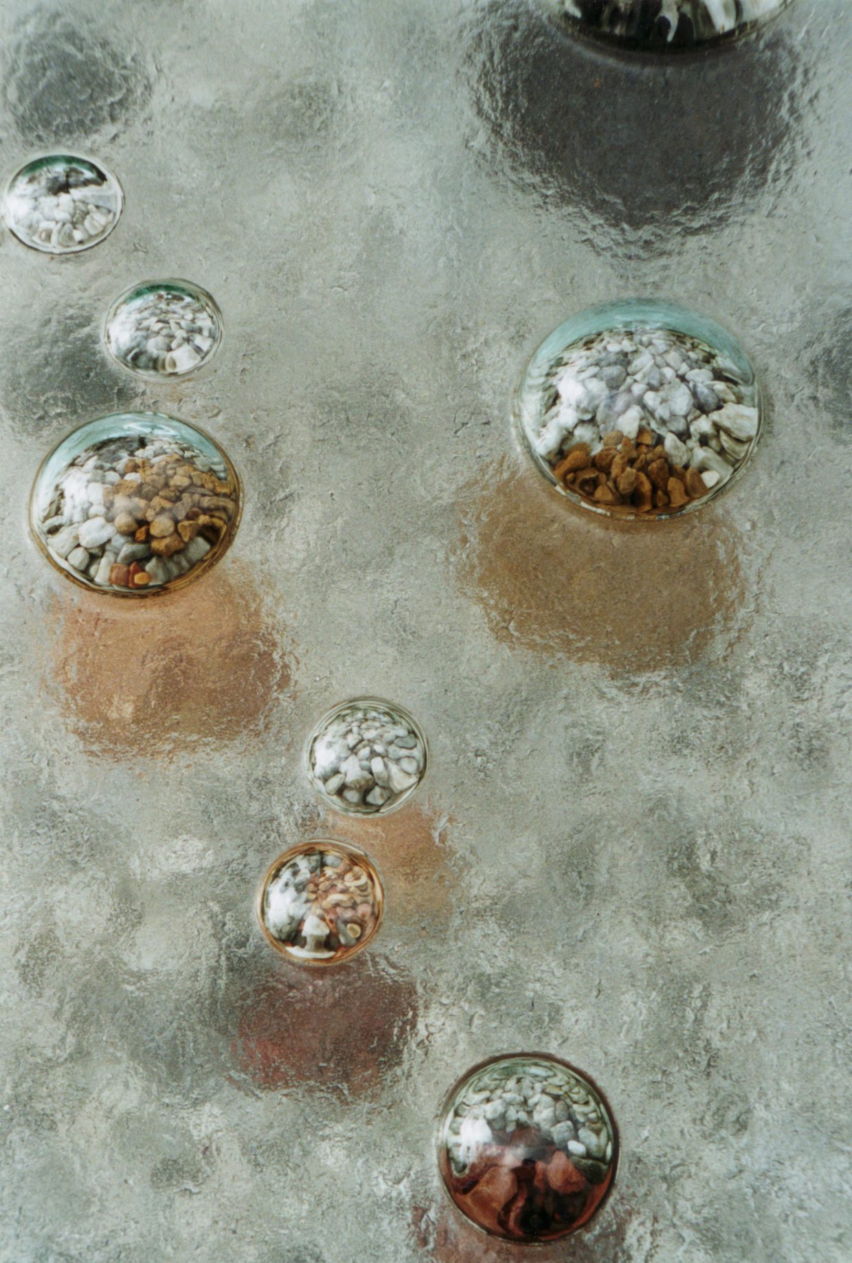 Uit de glasplaat komen de luchtbellen omhoog. Vier luchtbellen wuiven in de wind, alsof ze vertrekken. Elke luchtbel één letter van haar naam. In de bel een madelief, de ‘bellis perennis’ als teken van eeuwige schoonheid.