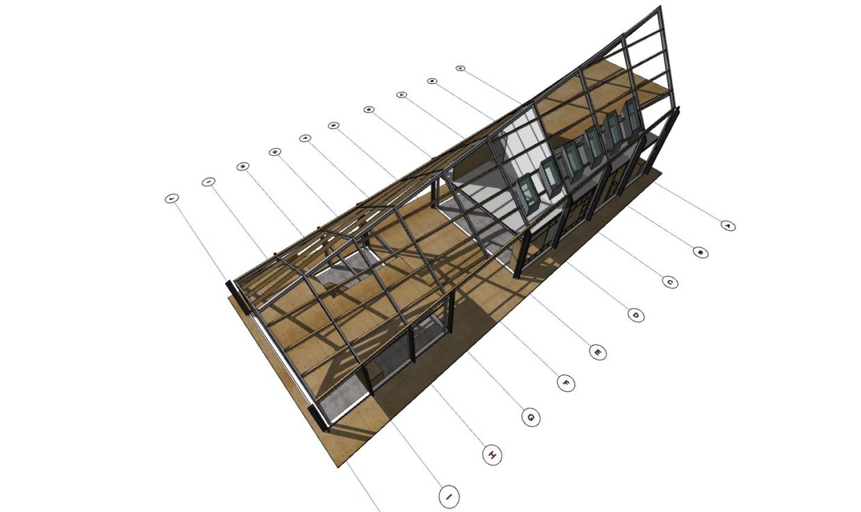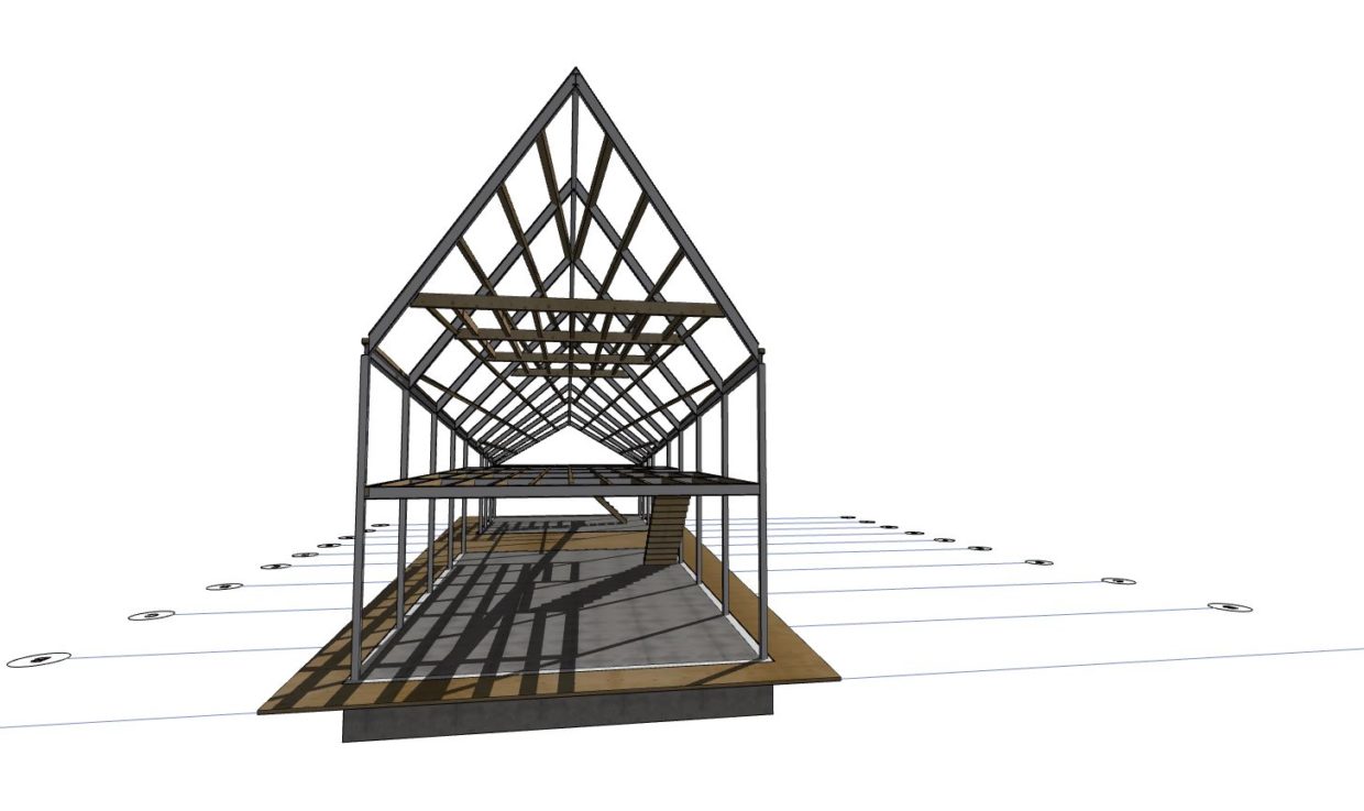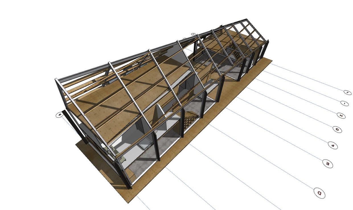 In ons plan is gezocht naar een optimale uitstraling van bovenstaande gedachte. Maar hoe zorg je dat een erf niet verrommeld. Door het gebouw als een soort Hallehuis te zien waarbij hoofdgebouw en bijgebouw en alle andere functies onder een dak worden geplaatst. Hierdoor wordt het hoofdgebouw juist versterkt. één uitstraling en geen kakafonie aan bijgebouwtjes. De kwaliteit van het bijgebouw doet ook niet onder voor het hoofdgebouw. Zwarte houten planken als gevelbekleding en eenvoudige stalen golfplaat geven het huis de uitstraling van een eenvoudig erfvolume.
